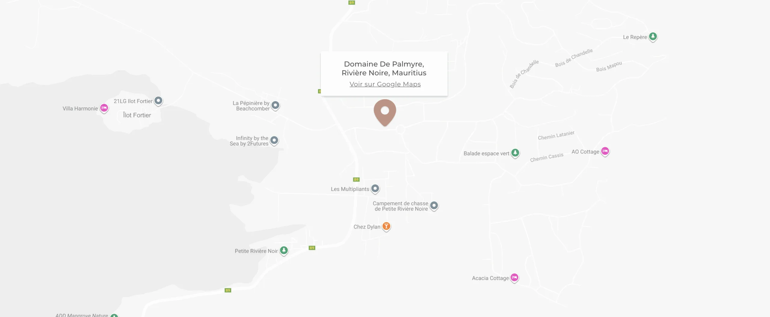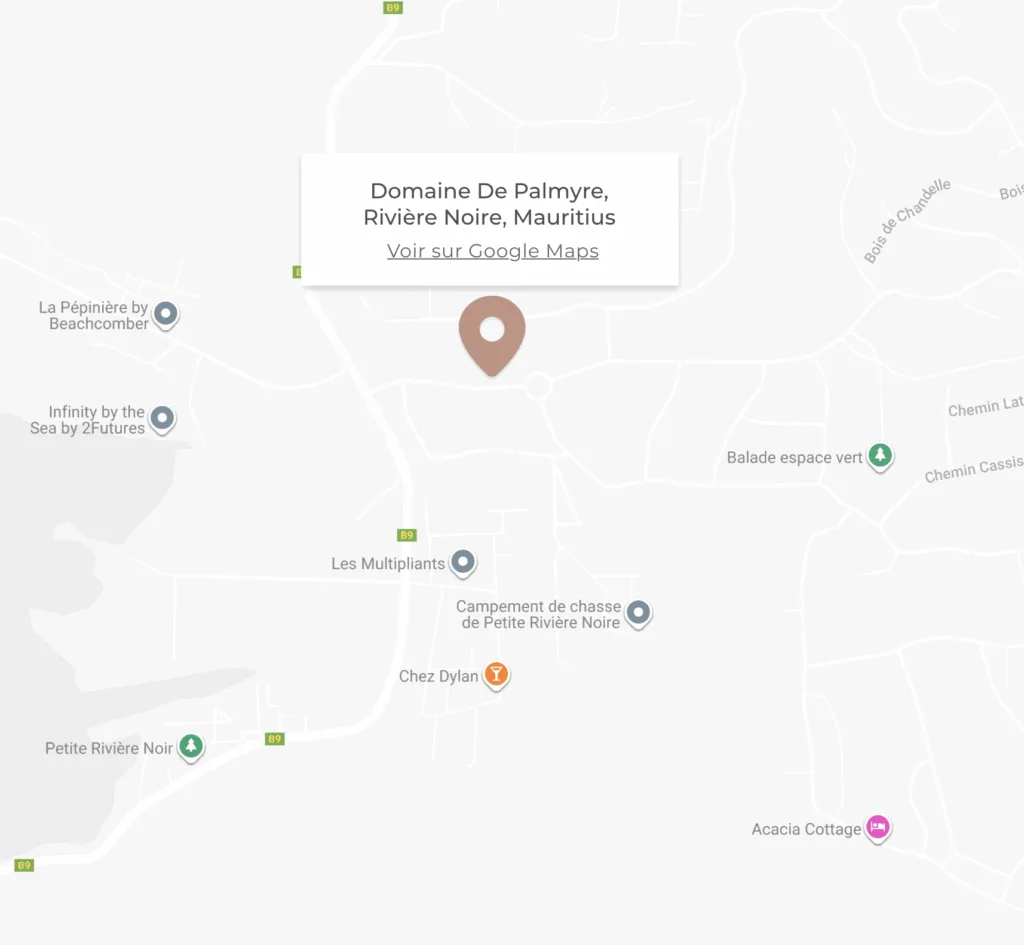 Le programme Jiva Santosha, idéalement situé sur les hauteurs du domaine de Palmyre à proximité de Tamarin, offre un accès rapide aux soins médicaux : cliniques privées réputées et pharmacies se trouvent à moins de 15 minutes. Une localisation qui allie tranquillité, sécurité et proximité des infrastructures essentielles pour ses résidents.